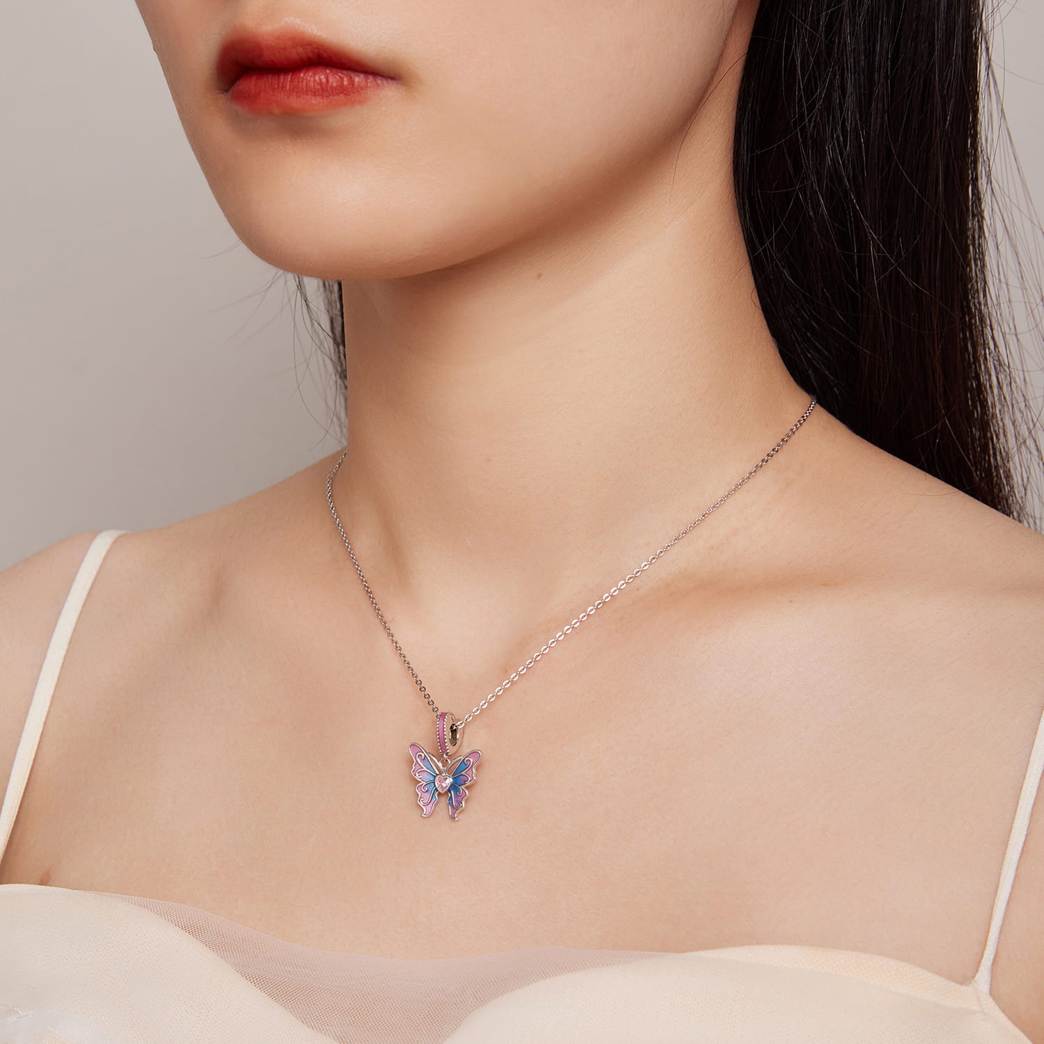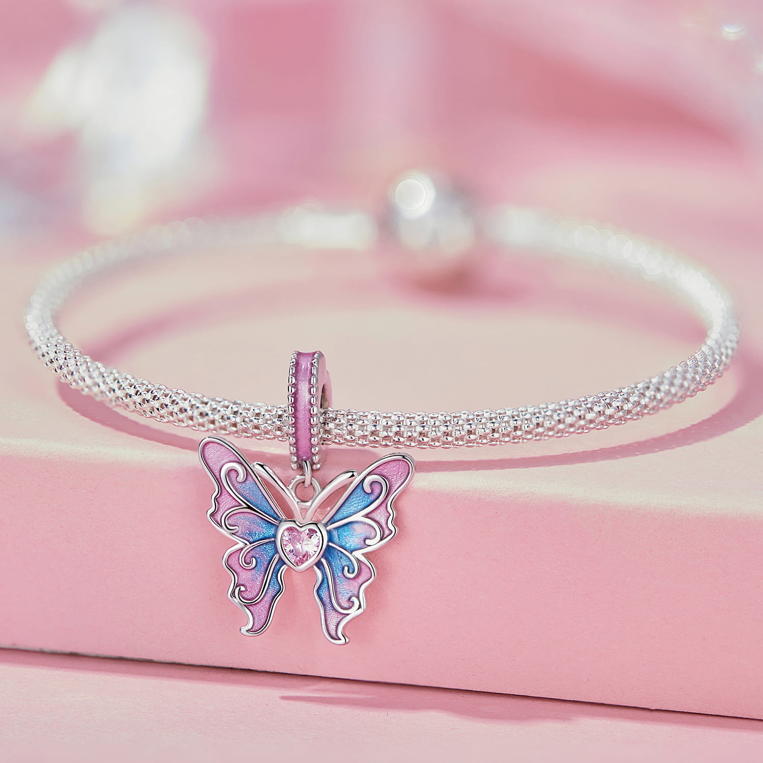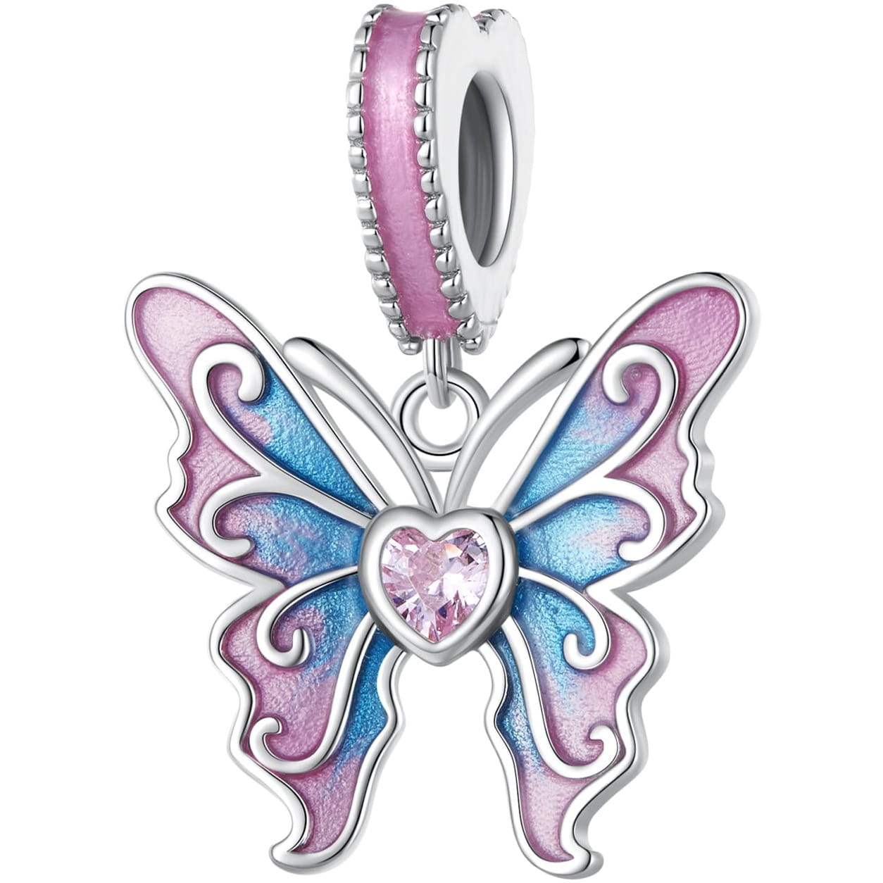 Piękny, okazały motyl ze skrzydłami ozdobionymi dwukolorową emalią. Platynowane srebro elegancko komponuje się z bladoróżową cyrkonią w kształcie serca, zaś całości kompozycji dopina emaliowana wstęga dookoła uchwytu charmsa.