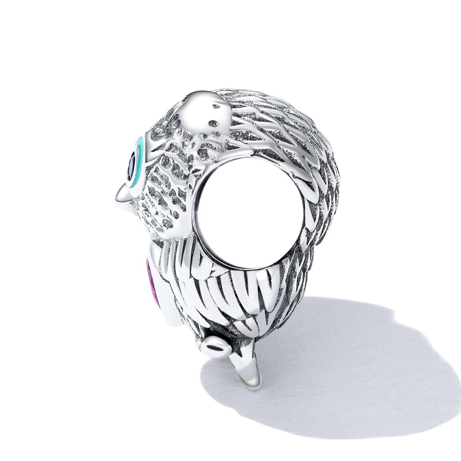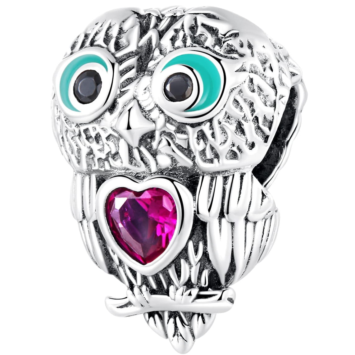 Słodka sówka z różową cyrkonią w kształcie serca na środku. Zdobienie w postaci turkusowych, emaliowanych oczu, dodaje charmsowi wyrazu.
