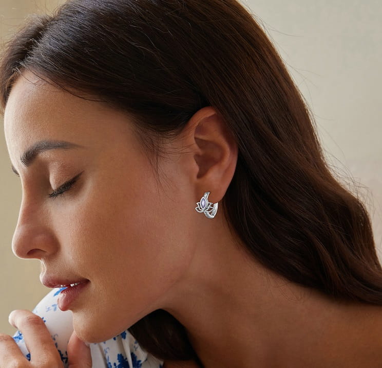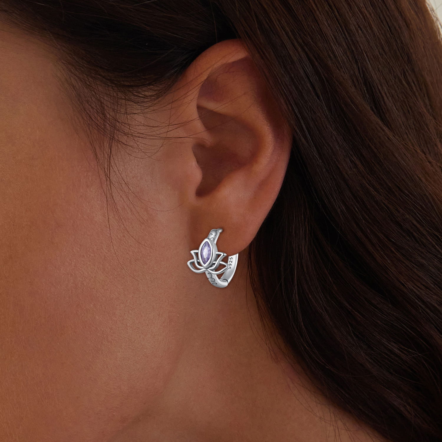 "Jestem oazą spokoju. Wyciszonym kwiatem lotosu na spokojnej tafli jeziora." - czy ten opis oddaje Twój charakter? A może po prostu szukałaś kwiatowego uzupełnienia swojej biżuterii? Nie musisz dalej szukać! Nasze kolczyki z lotosem zwraca uwagę przede wszystkim eleganckim, klasycznym designem oraz prostotą. Całości dopełnia nadająca dyskretnego blasku drobna, fioletowa cyrkonia.