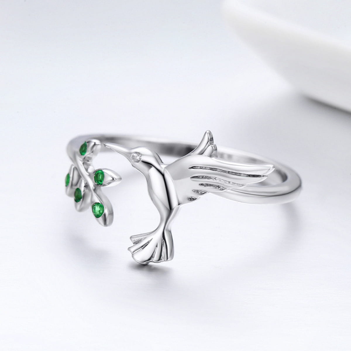Pierścionek z ptaszkiem lecącym obok szmaragdowej gałęzi z listkami podkreślonymi w subtelny sposob drobnymi cyrkoniami.