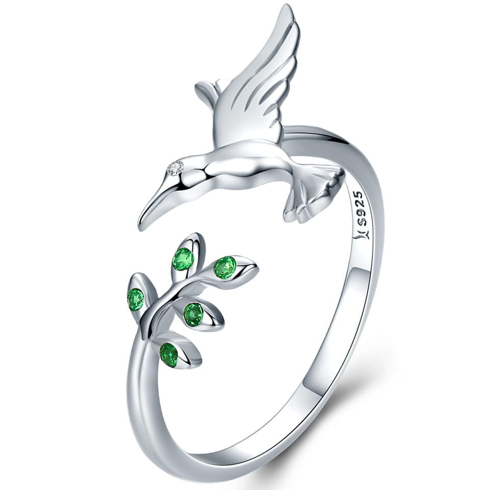 Pierścionek regulowany ze srebra - Ptaszek i zielona gałąź srebro 925