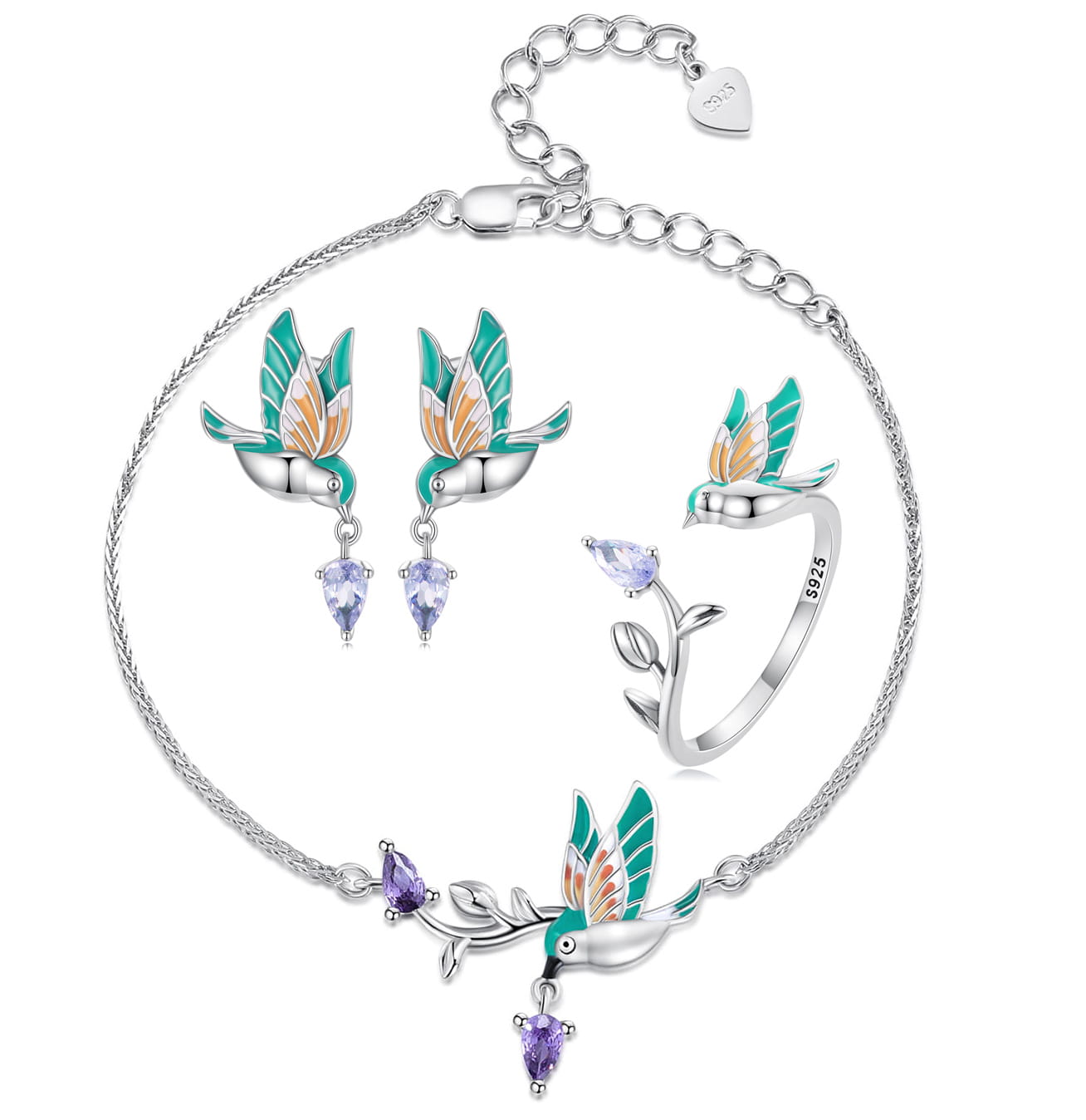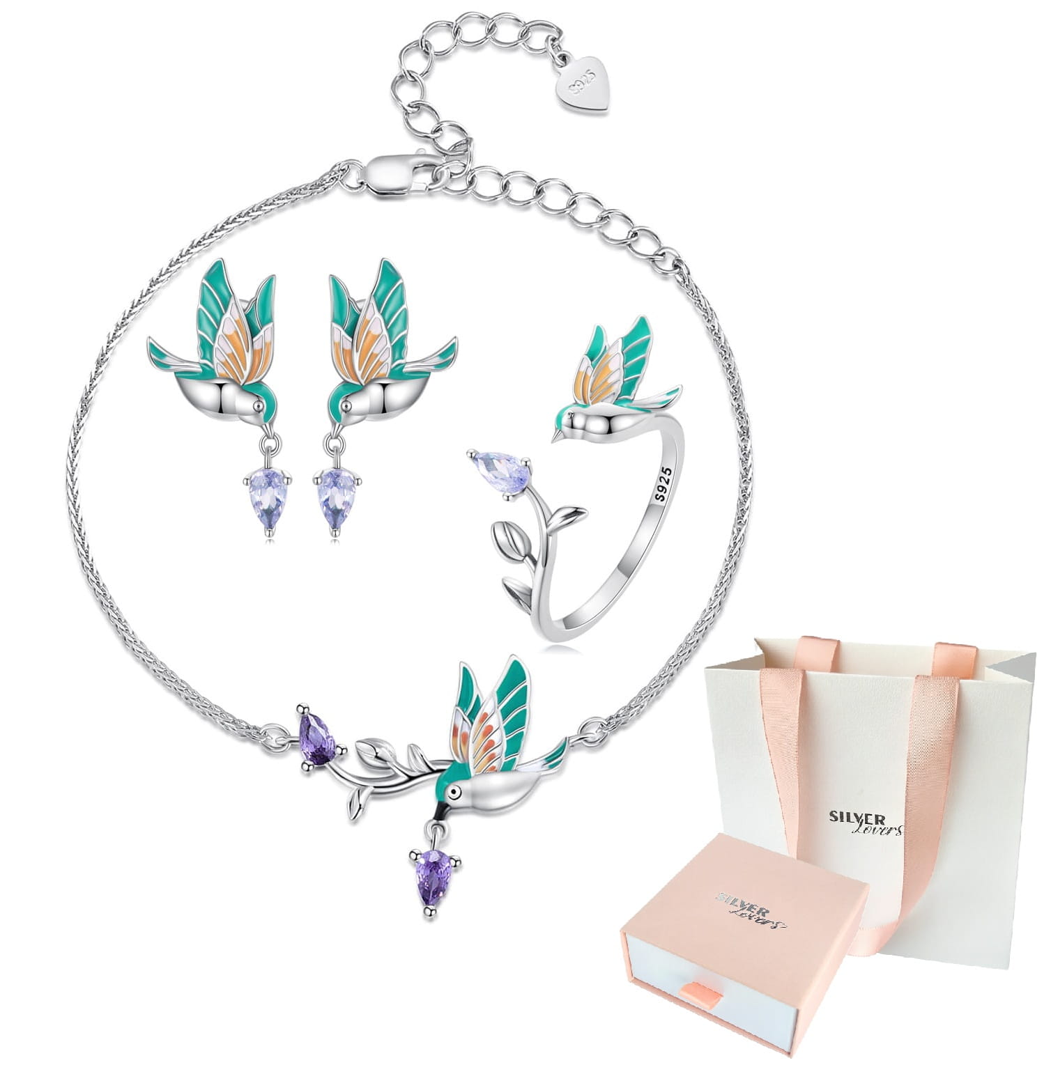 Zestaw biżuterii ze srebra z motywem kolorowego zimorodka: regulowana bransoletka, regulowany pierścionek i kolczyki.