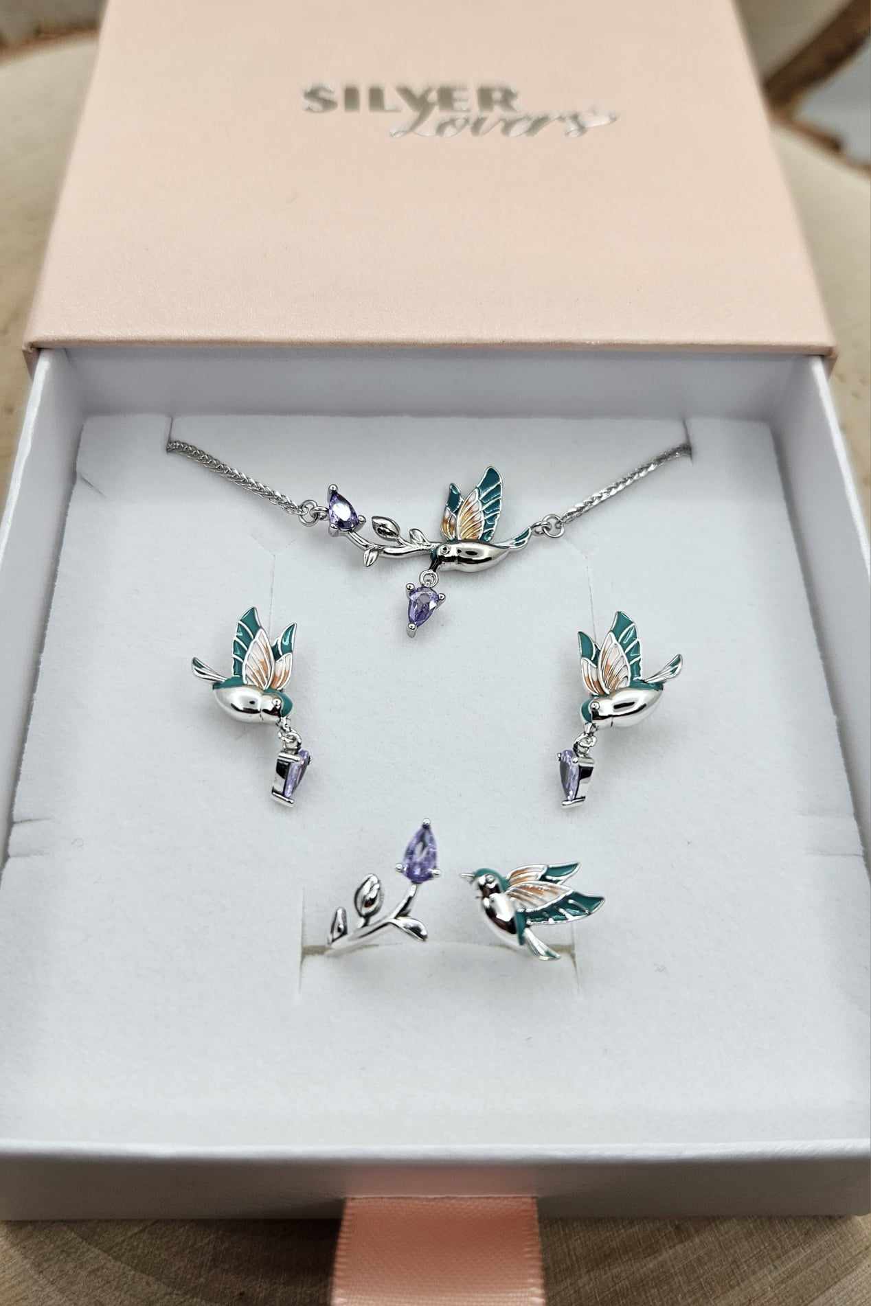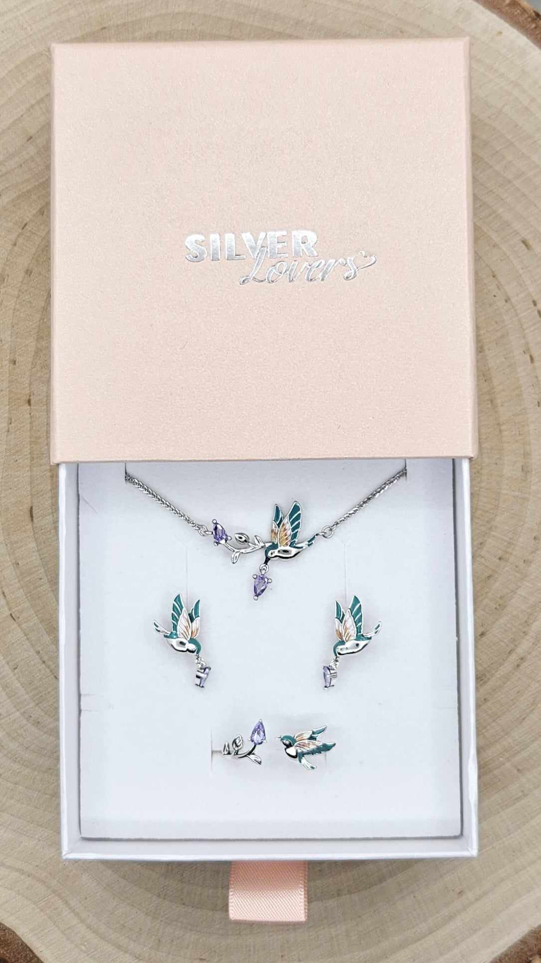 Prezent marzeń - komplet biżuterii ze srebra - Zielony ptak zimorodek srebro 925